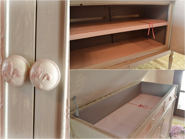 Y la parte inferior, con el trabajo de distintos stencils sobre las puertas, agregado de medias perlas y pintura dimensional